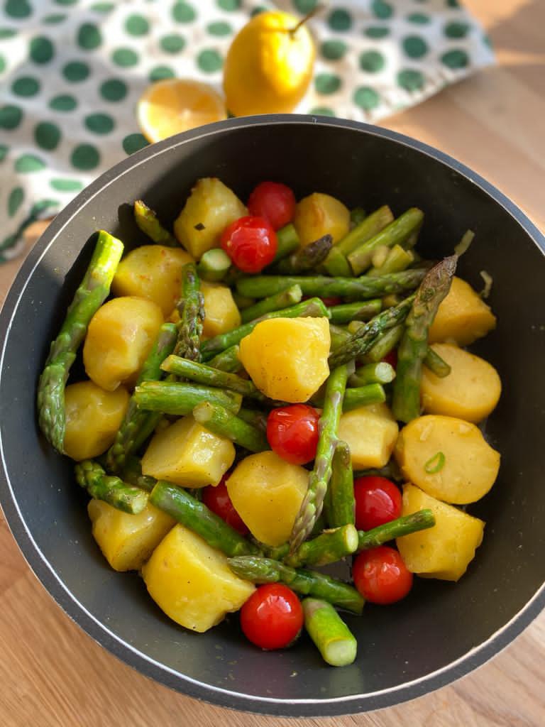 Die Kartoffeln garen, abkühlen lassen und – wenn nötig – schälen und halbieren. Spargel waschen, die unteren Enden eventuell schälen und in etwa 2-4 cm große Stücke schneiden. Frühlingszwiebeln fein schneiden. Das Olivenöl in einer Pfanne nicht zu heiß erhitzen und die Spargelstücke darin einige Minuten braten, bis sie schön bissfest sind. Dann Erdäpfel und Frühlingszwiebel dazugeben und ebenfalls kurz mitbraten. Zum Schluss die ganzen oder halbierten Cocktailtomaten, den zerbröselten Feta, Zitronensaft und Gewürze hinzufügen und alles gut durchschwenken. Dieses Gericht kann warm oder kalt genossen werden!