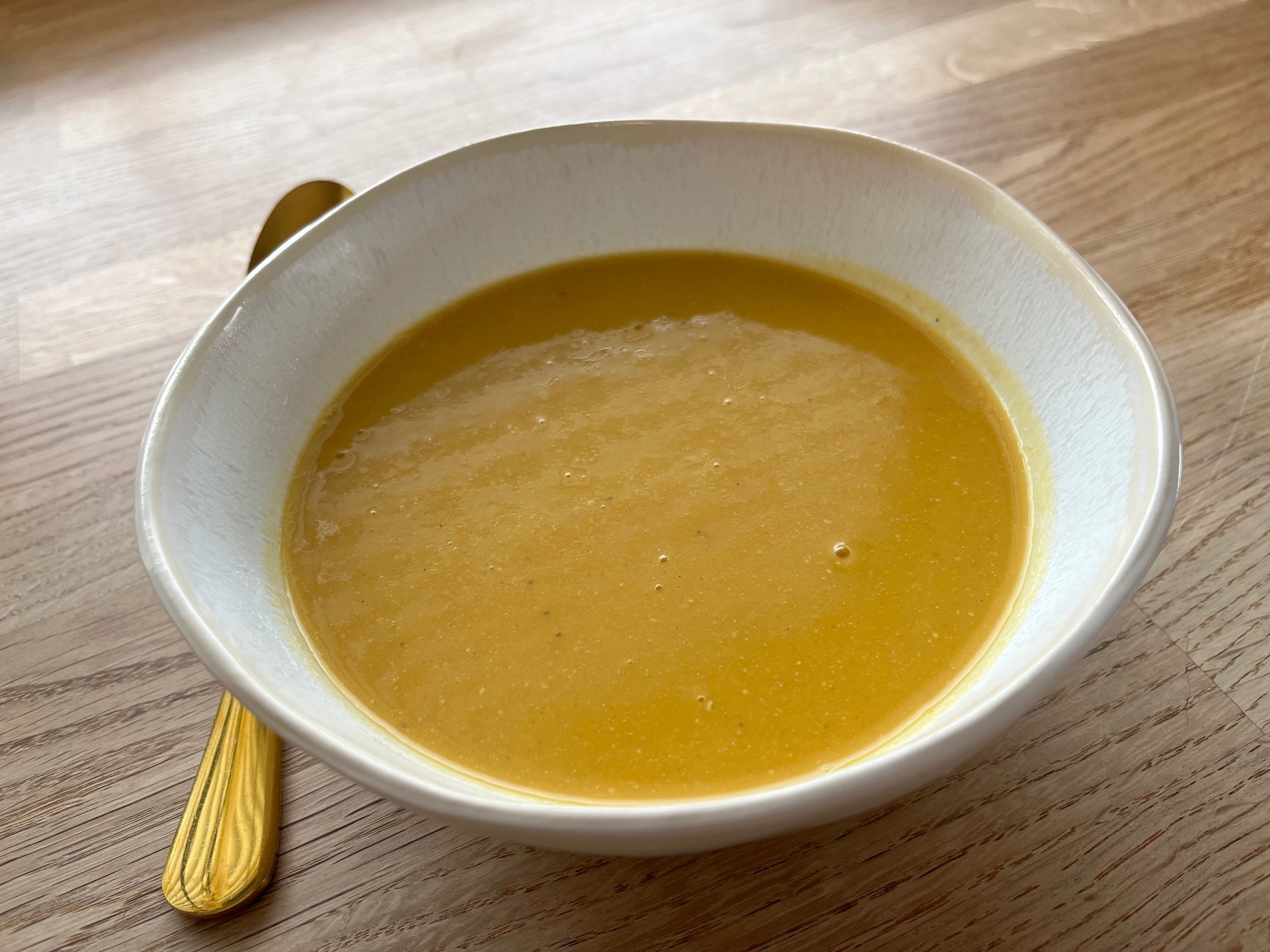- Wenn die Süßkartoffeln weich sind, das Erdnussmus hinzufügen, die Suppe mit dem Pürierstab mixen, bis sie schön sämig ist und nochmal mit den Gewürzen und Zitronen- oder Limettensaft abschmecken. Bei Bedarf die Konsistenz der Suppe mit Wasser verdünnen.