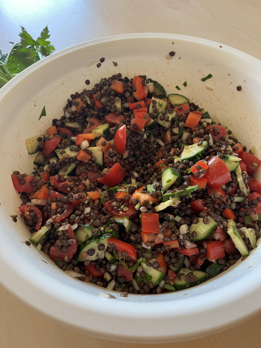 Ein köstlicher Mix entsteht hier aus den kleinen schwarzen aromatischen Linsen und viel Gemüse. Der sommerlich erfrischende Salat liefert viel Eiweiß, Ballaststoffe und Mikronährstoffe - ob solo oder als Beilage zB. zu Fisch, Fleisch... Perfekt beim nächsten Grillevent!