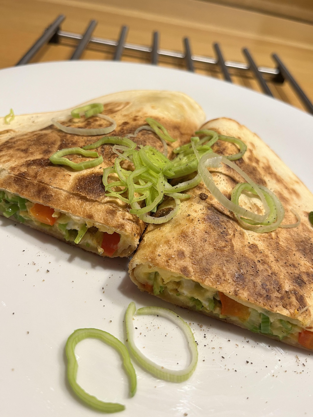 - Die verquirlten Eier über das Gemüse geben, den geriebenen Käse darüber verteilen und sofort einen Wrap oben drauf legen.