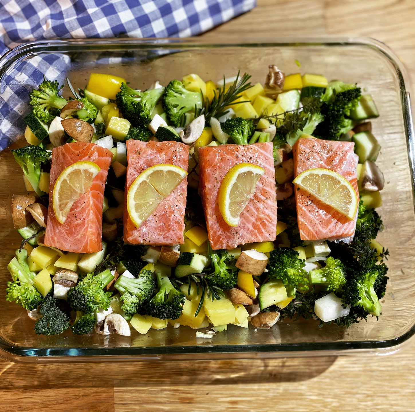 - Nach 35 Minuten den Lachs aufs Gemüse betten und für weitere 15 Minuten ab ins Rohr.